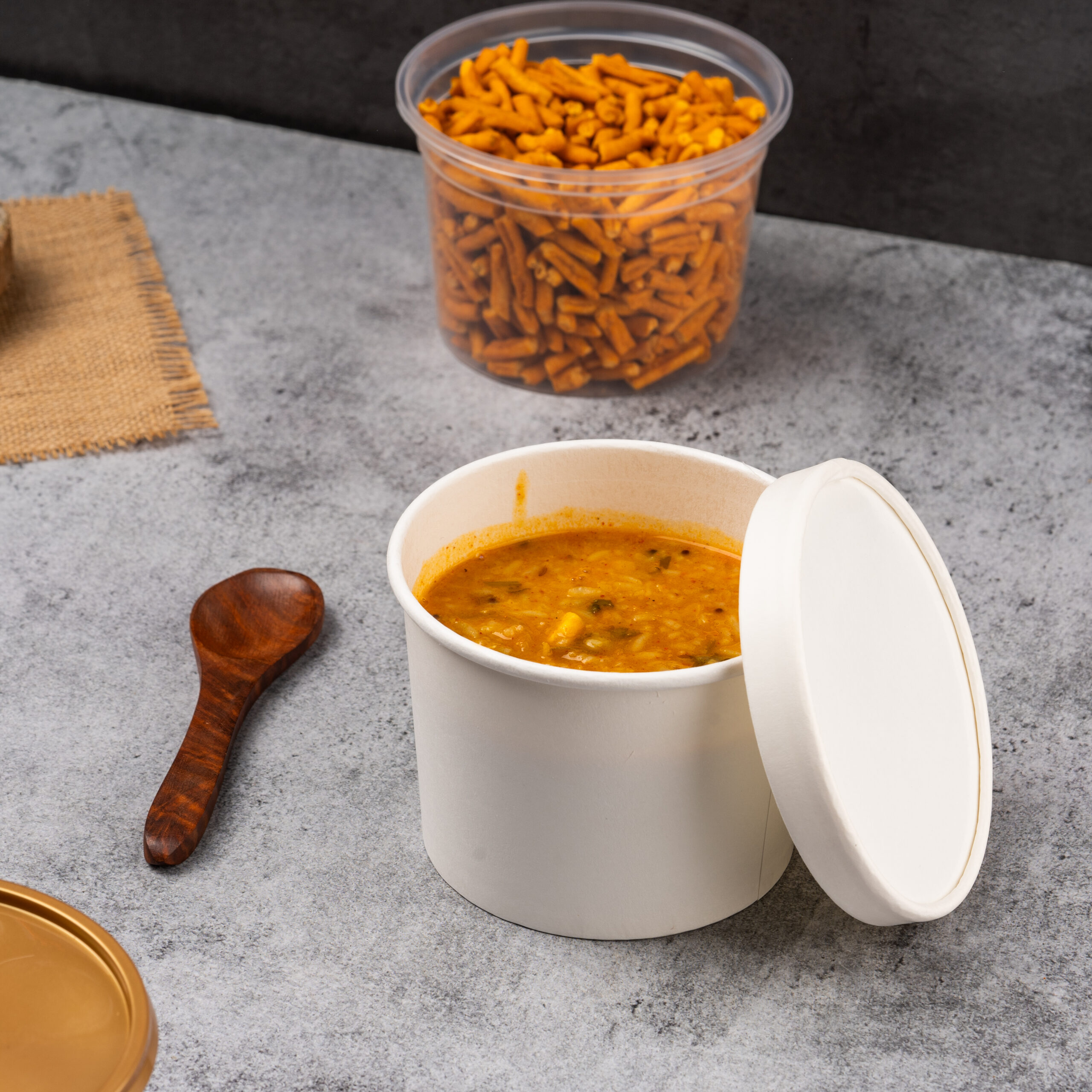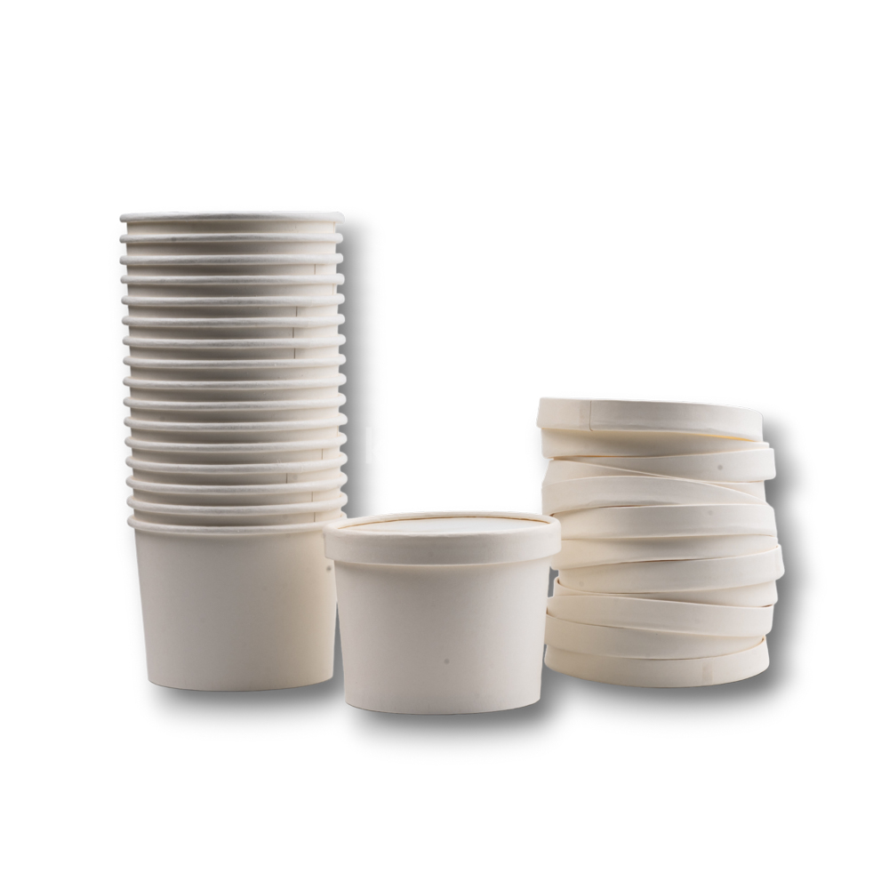 and other foods. They can hold liquids and oily foods safely without any leakage issues., curd, curry, Gravies, khichdi, rice, The tight locking on White paper tub containers makes them a preferred choice for packing dal